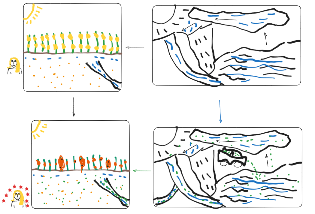 In der Landwirtschaft werden oft Pestizide gegen Schädlinge und Dünger für besseres Pflanzenwachstum eingesetzt. Wenn es regnet, werden diese Stoffe von den Feldern in Flüsse, Seen oder ins Grundwasser gespült. Auch Gülle aus der Tierhaltung gelangt so ins Wasser. Das führt dazu, dass sich Algen stark vermehren und Fische sterben, weil zu wenig Sauerstoff im Wasser bleibt.